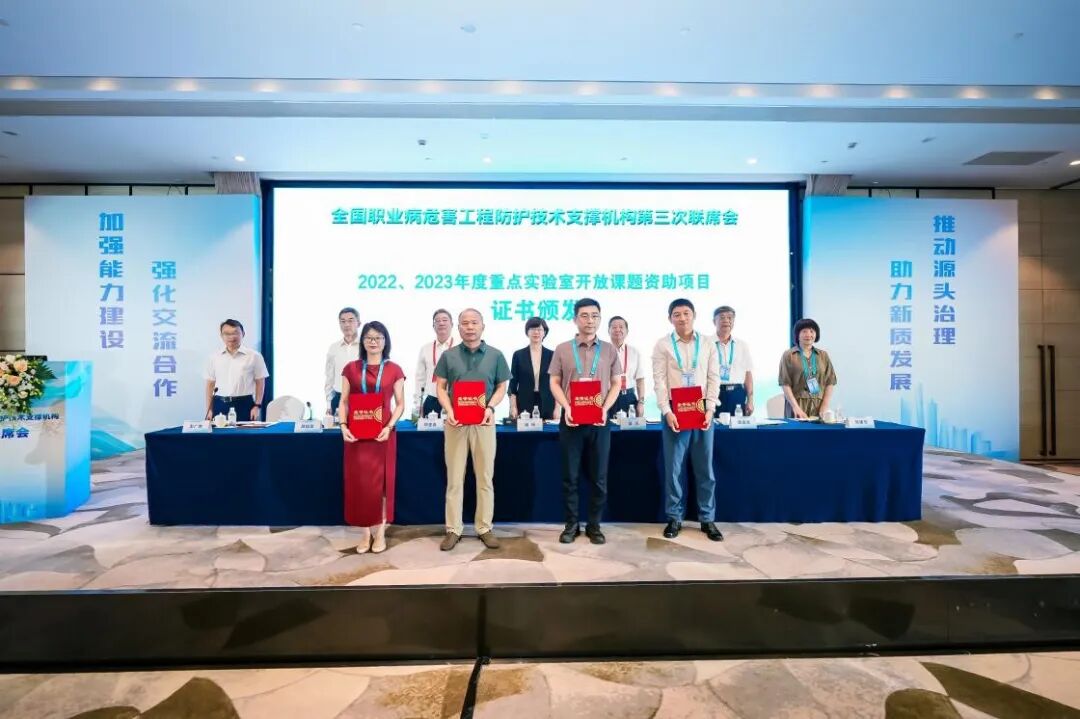 开幕式后,与会领导为获得2022、2023 年度重点实验室开放课题资助的4家省级支撑机构和遴选的尘毒危害工程防护先进适宜技术7家代表单位颁发荣誉证书和牌匾。